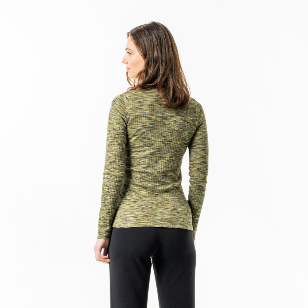 Na první pohled jednoduchý (ale kvalitní!) top z jemného žebrovaného interlocku s vysokou, zcela přirozenou pružností. Nicméně je skvělý na dotek a neuvěřitelně pohodlný na nošení. A pak jsou tu barvy. Příze pro látku byly barveny různě, v sytých odstínech aktuální kolekce, takže barevný vzor plynule splývá, neustále se mění a přechází do sebe. Vypadá působivě, přesto je decentní a hodí se prakticky k jakémukoli jinému designu na podzim a zimu