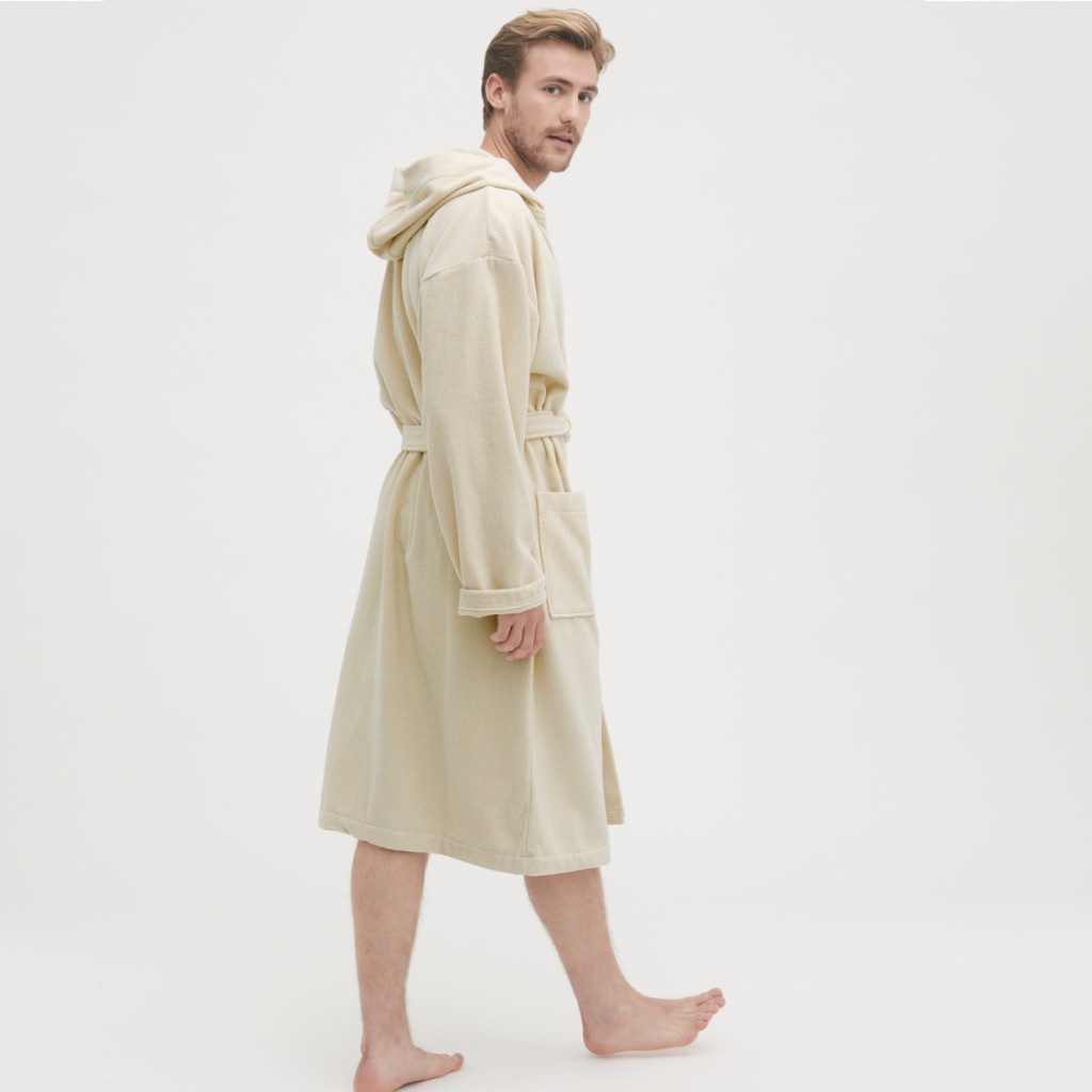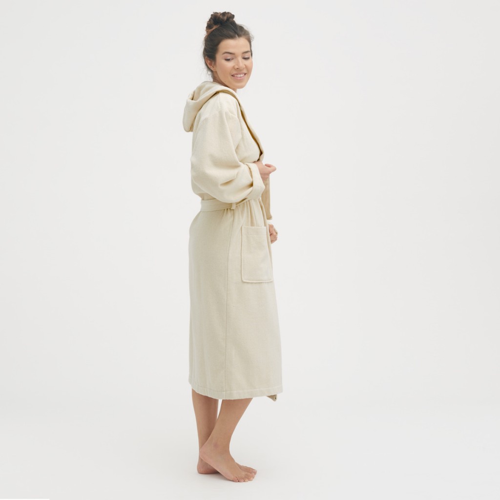 Unisex župan ze 100% biobavlny s kapucí. Má dvě kapsy a dvojitě prošívané švy.